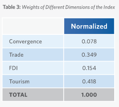 The weights assigned to each dimension of the index are derived from the data itself. Flows of tourists within the region are 42 percent of the index; merchandise trade is 35 percent; investment flows are 15 percent; and the convergence sub-index is 8 percent.