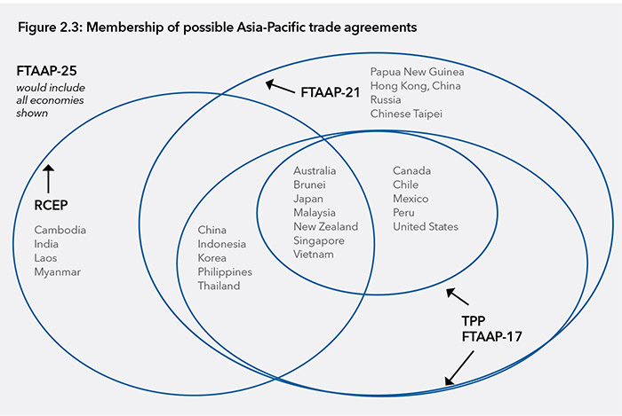The economic structure of the Asia-Pacific has changed dramatically since APEC was launched in 1989. APEC membership, which has been updated modestly, no longer coincides with the region’s major trading relationships. An early, difficult choice therefore concerns the definition of an FTAAP negotiating group. RCEP membership is based on ASEAN’s FTA partners, while the TPP represents self-selected APEC economies. If FTAAP were to be based only on participants of RCEP and the TPP, it would have to go beyond APEC membership and also include Cambodia, India, Laos and Myanmar, while excluding Hong Kong (China), Chinese Taipei, Russia, and Papua New Guinea. Further, as Scollay (2014) notes, additional non-APEC members may eventually join RCEP and the TPP.