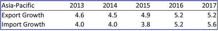 Trade growth in the Asia-Pacific is expected to post a moderate recovery in 2015 with exports growing at 4.9 percent and imports at 3.8 percent, down from 4.5 percent and 4.0 percent respectively in 2014. However, these rates are significantly lower than trade growth in the years leading up to the Great Recession, causing some to wonder whether trade growth relative to GDP growth has reached a peak.