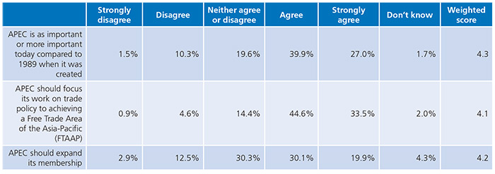 This is not a survey of public opinion but rather, a survey of those whose views influence policymaking, especially at the regional level. As some of the questions tend to be technical, they require a relatively deep knowledge of developments at regional level. However, we do believe that those surveyed include those who are responsible for influencing and often making decisions on various aspects of their economy’s positions within different regional groups.