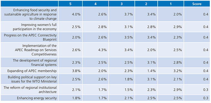 12. What do you think should be the top 5 priorities for APEC Leaders to address at their upcoming meeting in Danang? Please select ONLY five (5) issues, using a scale of 1-5, please write 1 for the issue you think is most important, 2 for the next most important issue, 3 for the third most important, 4 for the fourth most important and 5 for the fifth most important.
