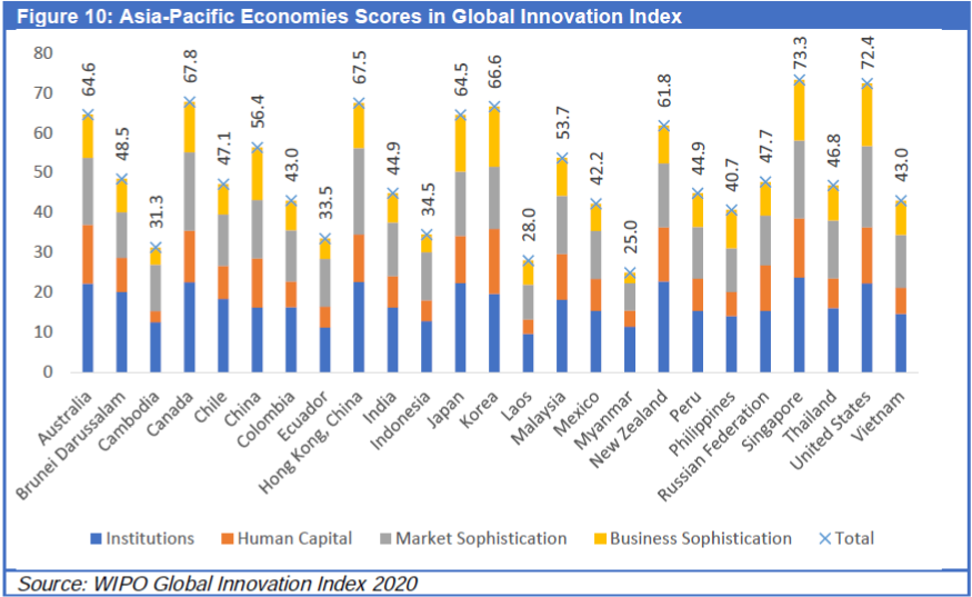 Over the years, China, Vietnam, India, and the Philippines have gained the most in the index ranking and are now in the top 50. Given innovative growth is one of the pillars of APEC’s growth strategy, initiatives that focus on improving performance in various dimensions of the index would be one way to improve the region’s overall performance. However, understanding the reasons why the market prefers to invest in larger firms would be a key to channeling funding towards the MSME sector. This points to a need for regional economies to make improvements to the environment for innovation.